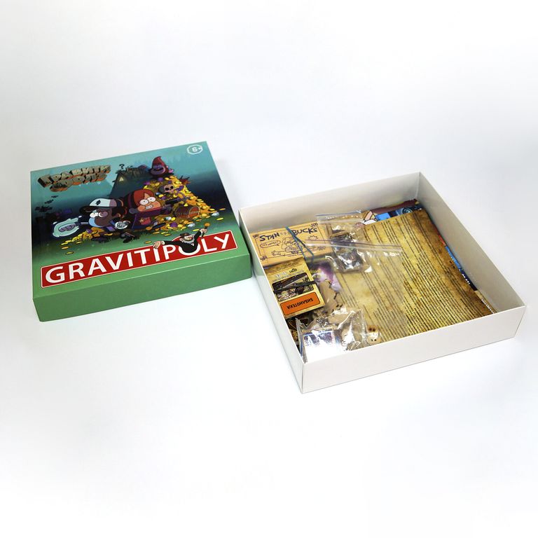 Глянцевое поле из плотной бумаги содержит множество зданий из мультфильма, а центральная часть выполнена по страницам дневников «Гравити Фолз» с множеством загадок и существ.
