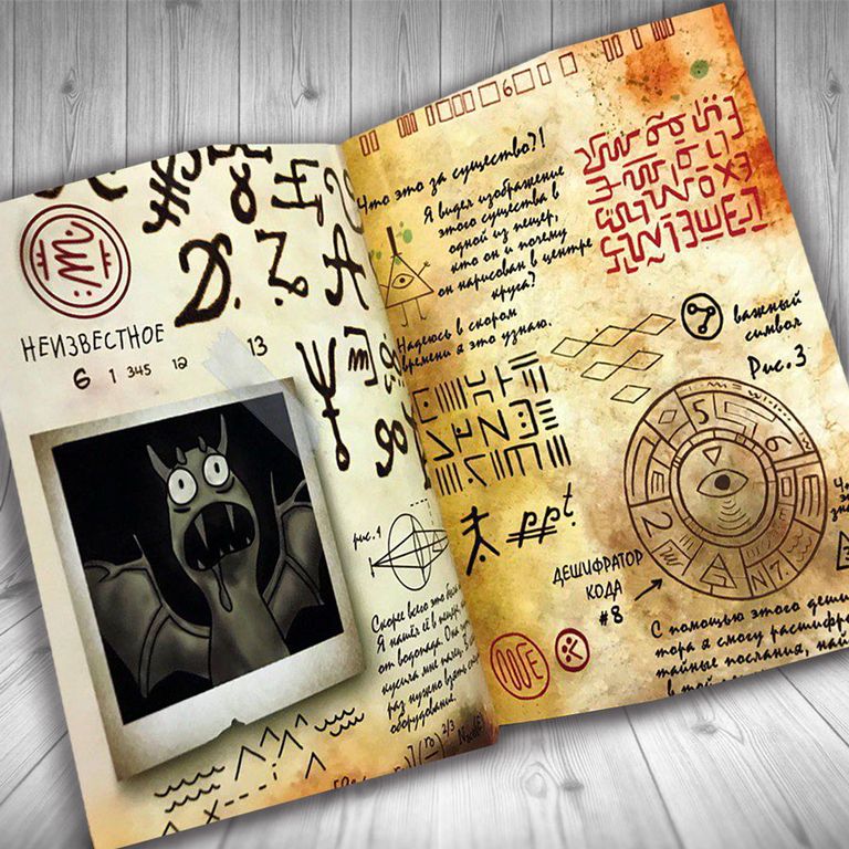 В Дневнике Стэна №1: 32 страницы с картинками, текстами, шифрами, далее около 50 чистых листов для самостоятельного заполнения рисунками, историями, вашими приключениями.